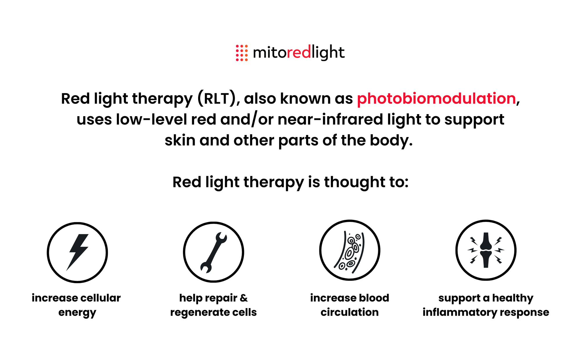 The best-studied mechanism of action surrounding red and near-infrared light therapy is the stimulation of mitochondrial energy production in the cells. Mitochondria are tiny organelles (organs within a cell) that produce all of the energy that our cells and our bodies ultimately need.