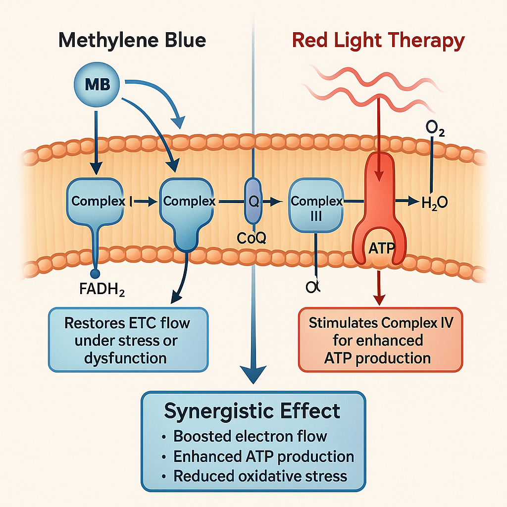 Methylene blue enhances red light therapy by supporting mitochondrial Complexes I and III, helping restore electron flow and reducing oxidative stress—especially in aging or damaged cells. This upstream support amplifies the effects of red light, which targets Complex IV to boost ATP production, cellular repair, and collagen synthesis.